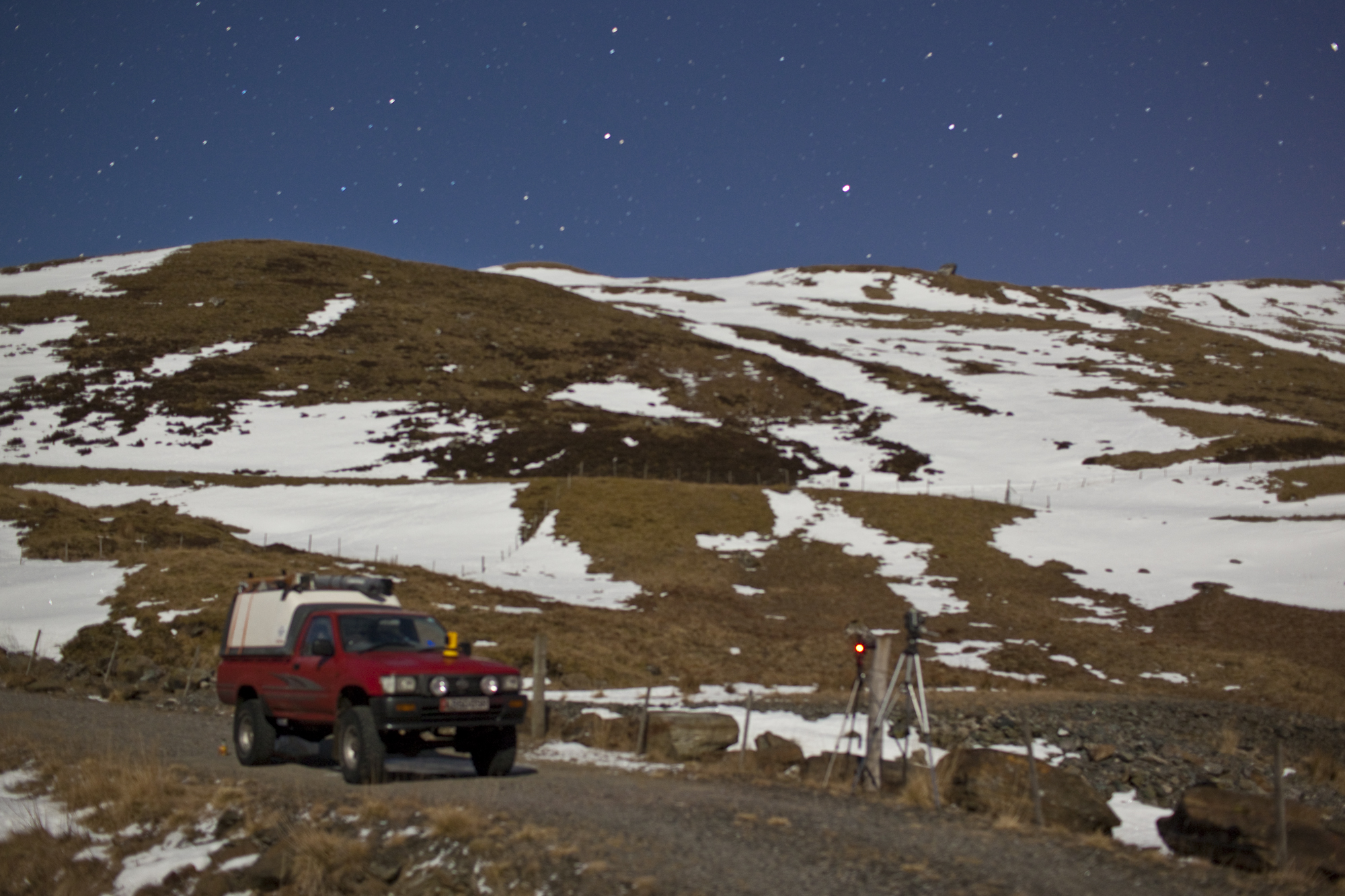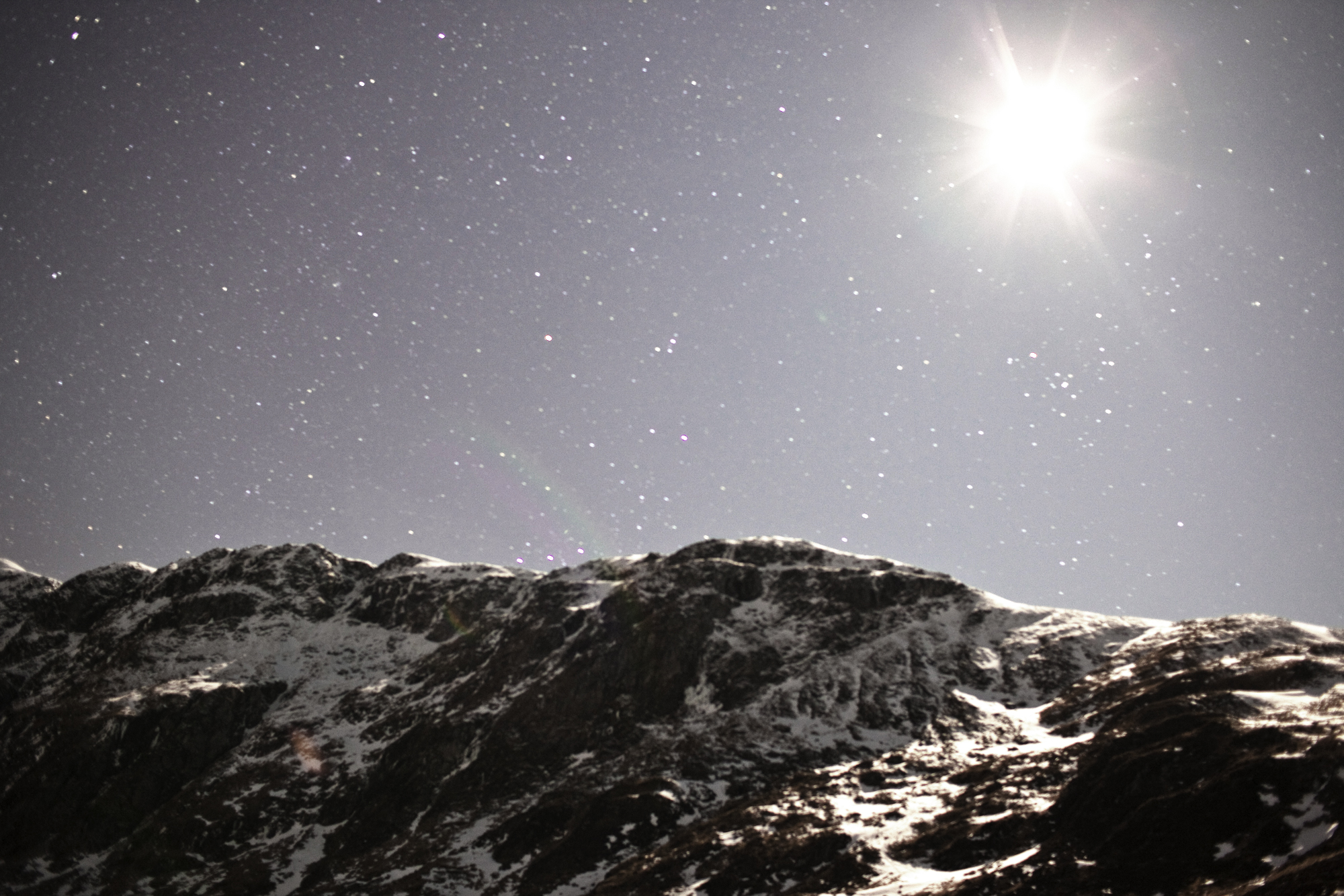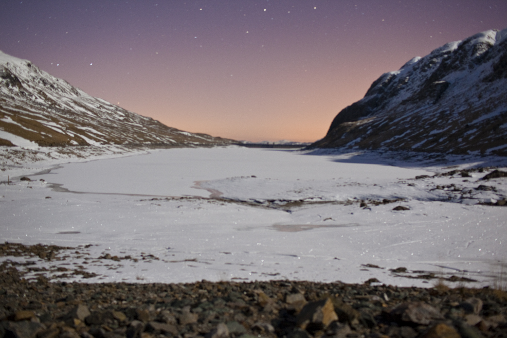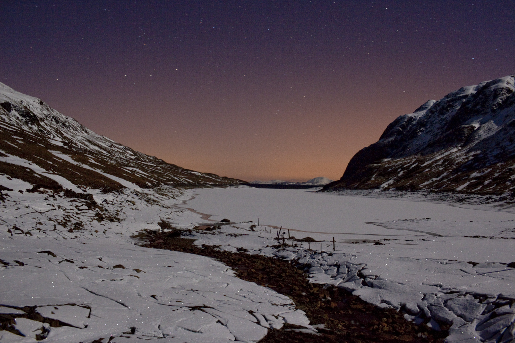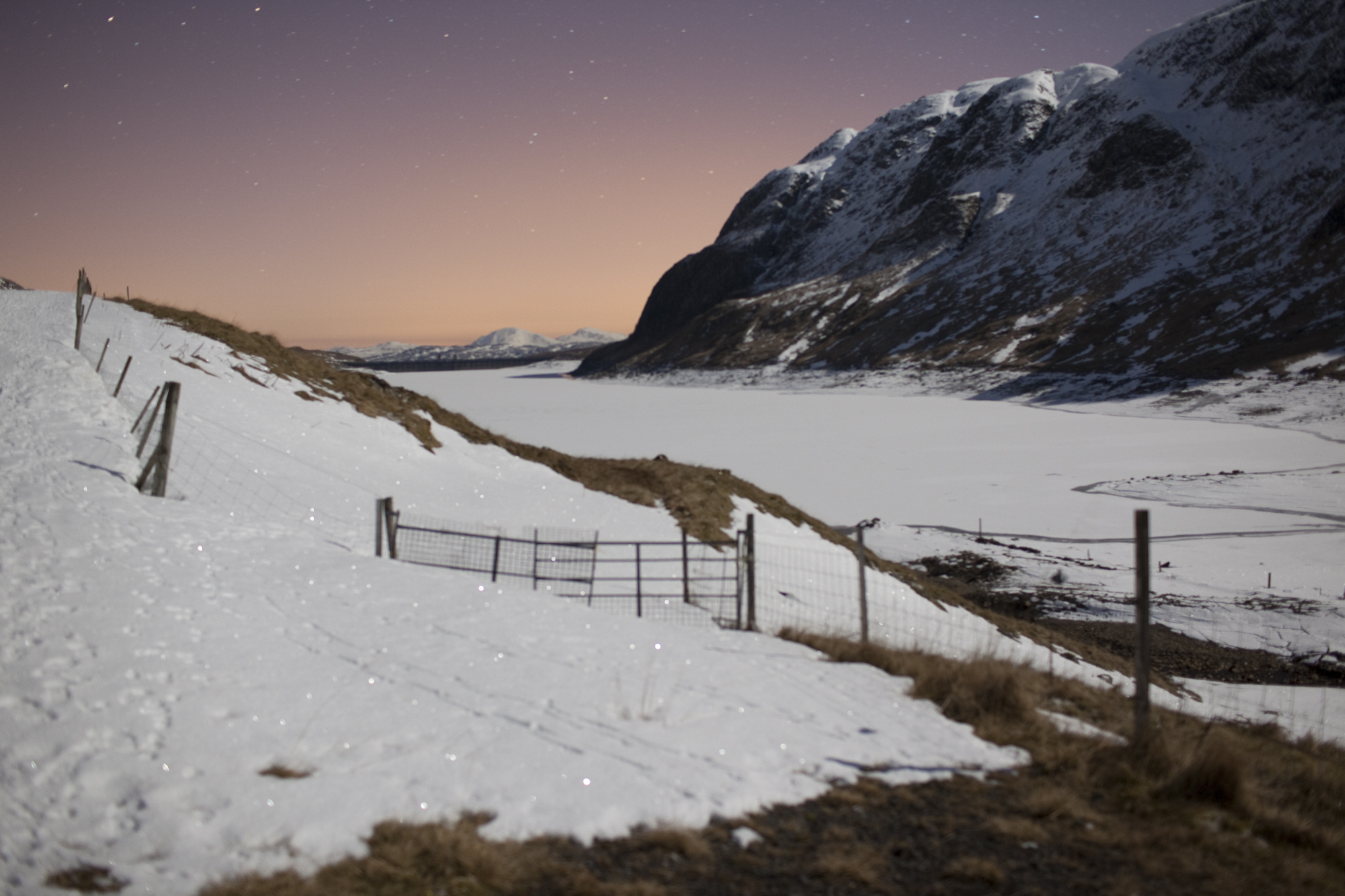 I drove slowly through the drifts and ice to reach the far end of the loch with the dam and incredibly the faintest glow of Killin town in the distance. The pink glow of light pollution peeking from behind the horizon. A glorious day of sunshine and clear skies lies hand in hand with twinkling starlight and hard moonlight.